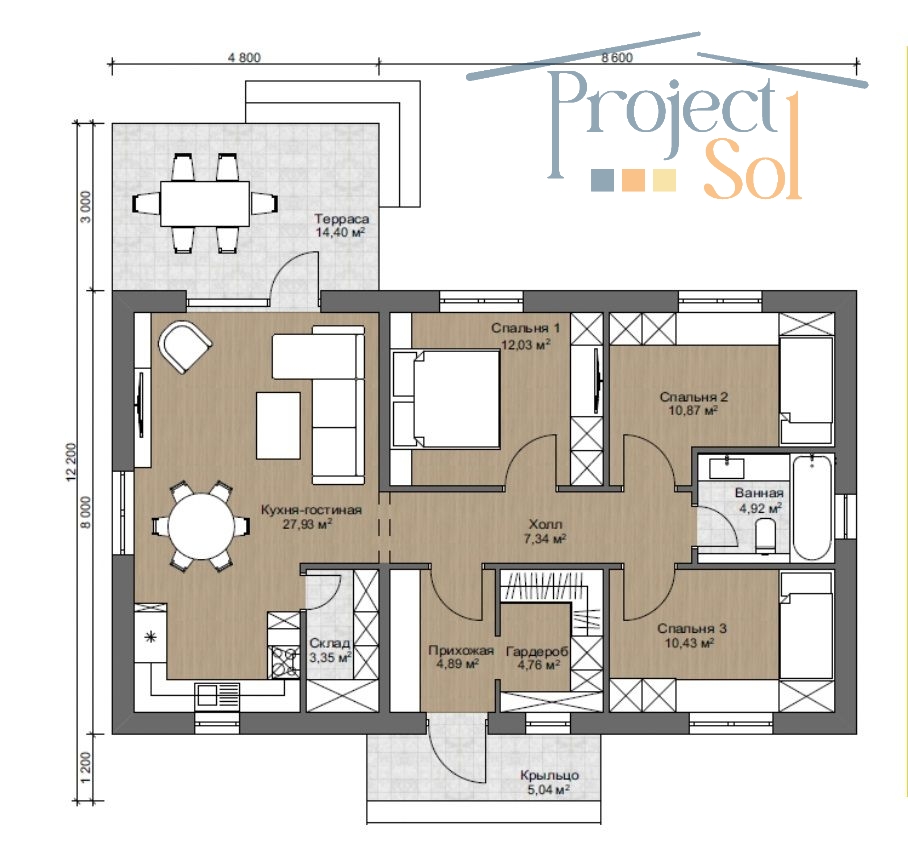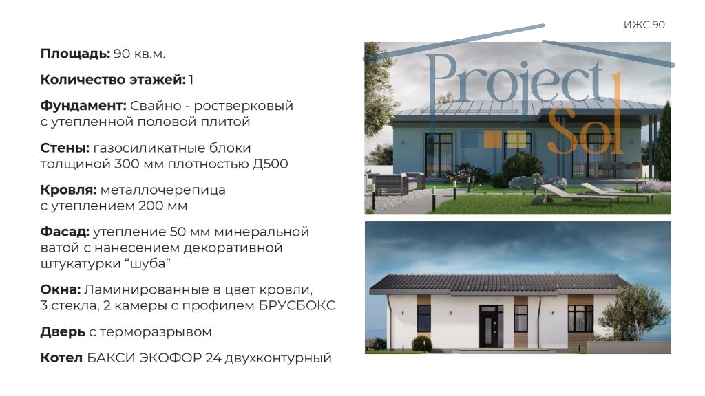 Материалы: Фундамент: монолитная плита 300мм Стены: газосиликатный стеновой блок 300мм с утеплением минеральной ватой 50 мм Облицовка: декоративная штукатурка и декоративные деревянные элементы Подшив навеса и веранды планкеном из лиственницы Кровля: 200мм с утеплением из металлочерепицы Качественные окна: энергосберегающие стеклопакеты. Дорогая входная дверь TOREX